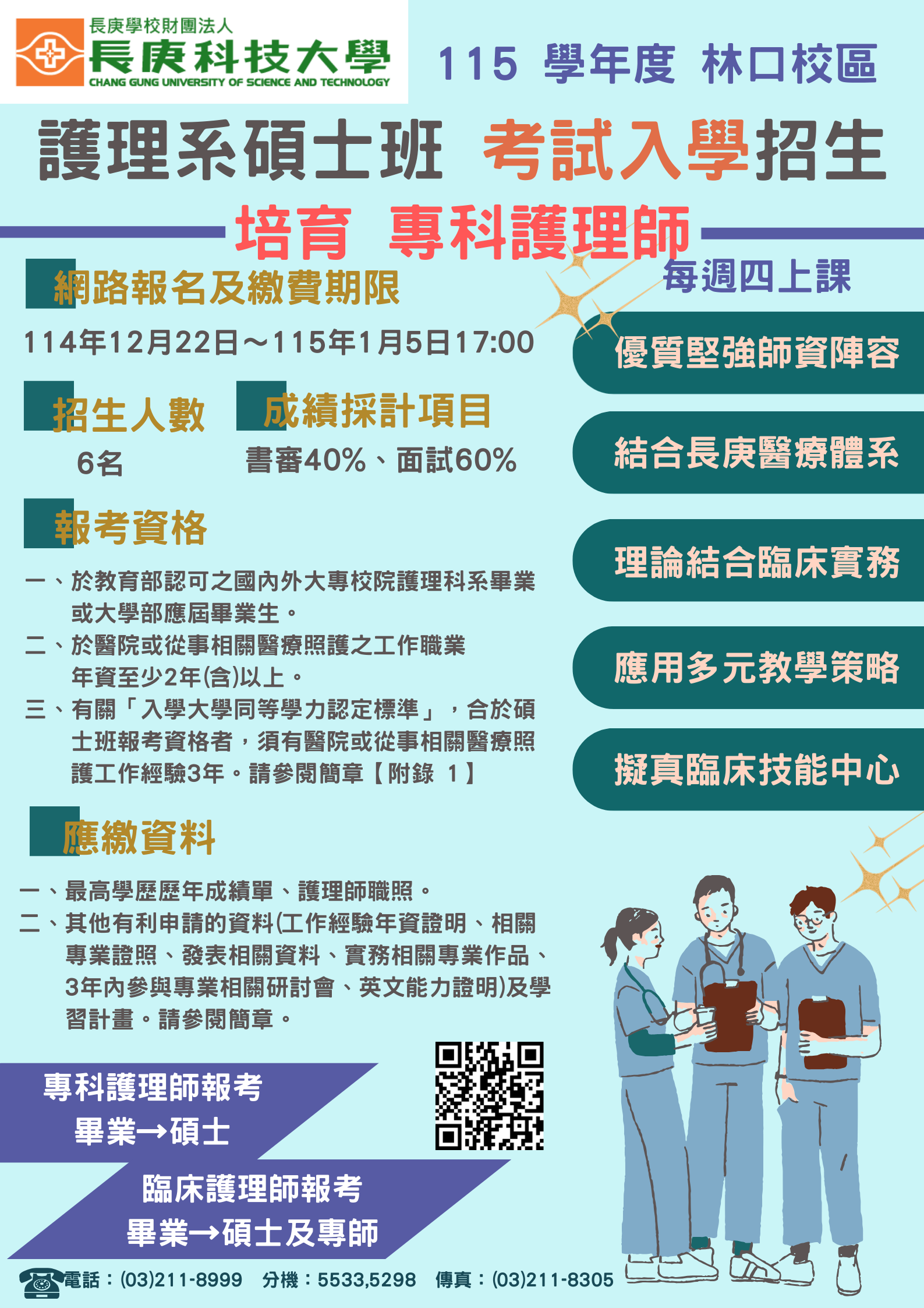 長庚科技大學(林口校區)115學年度護理系碩士班(培育專科護理師)考試入學招生開始了!