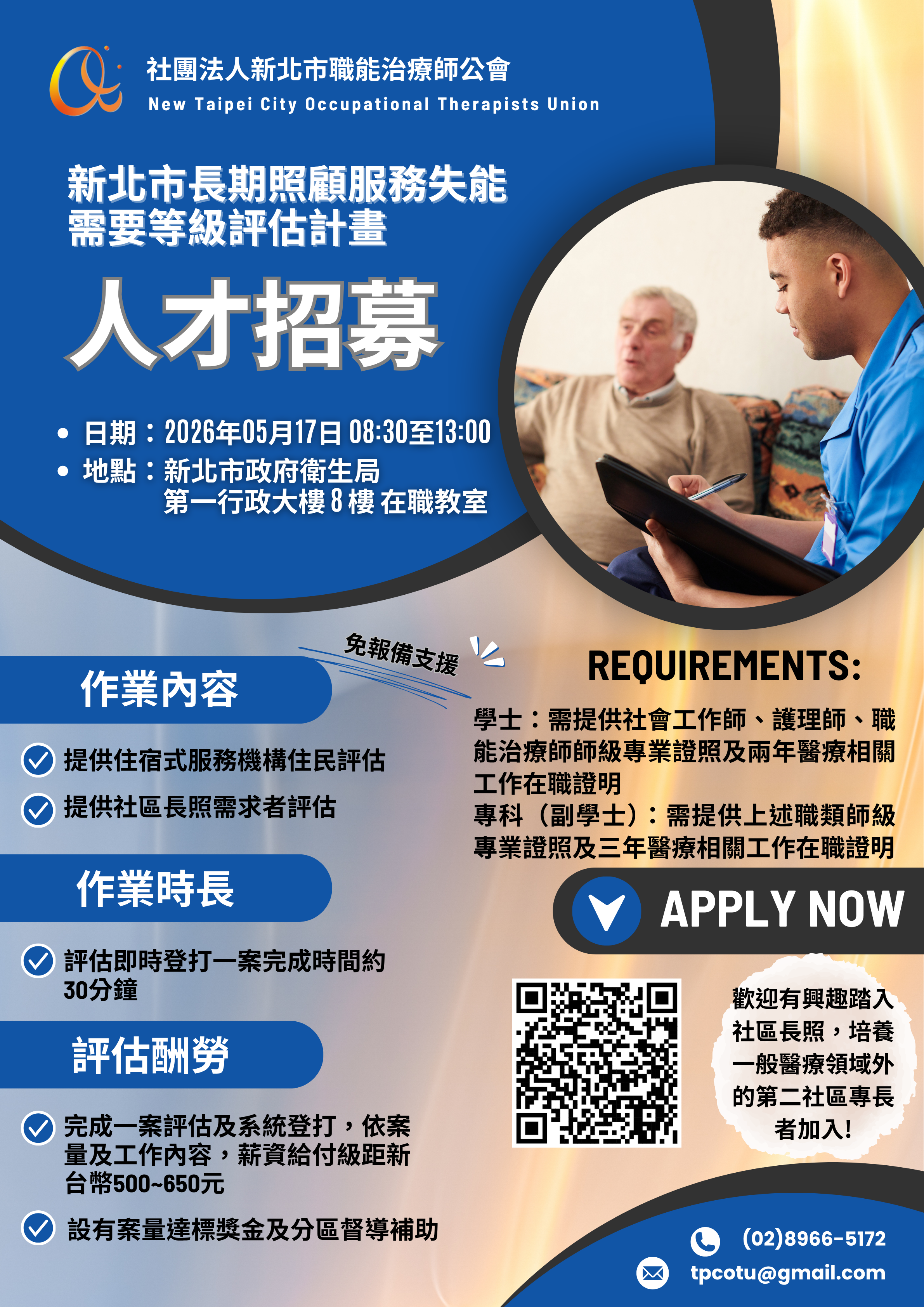 新北市職能治療師公會承接新北市政府衛生局115年度「新北市長期照顧服務失能需要等級評估計畫」,現正招募計畫案評估人員,惠請協助公告周知並鼓勵符合資格之會員及相關人員報名參加評估人員教育訓練課程,計畫案簡介暨課程簡章詳如附件,請查收,謝謝。